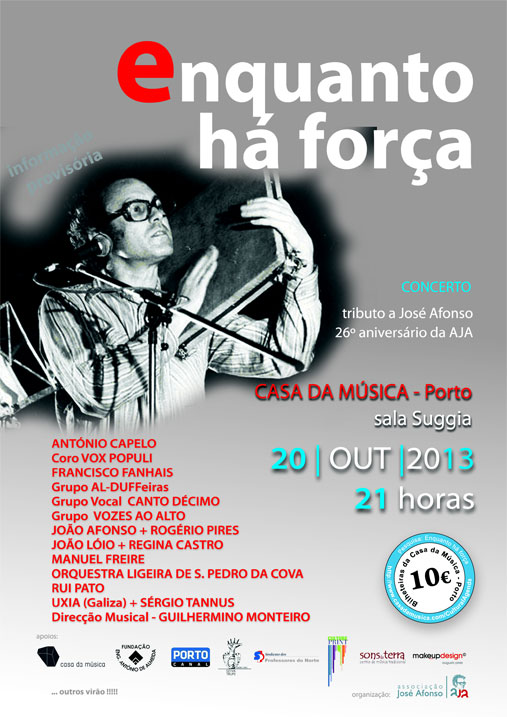 O 26.º aniversário da Associação José Afonso é o pretexto para celebrar a vida e obra desta figura-chave da música popular portuguesa. Neste concerto, juntam-se alguns dos seus companheiros de estrada e uma nova geração, que cresceu com o “poeta, andarilho e cantor”.